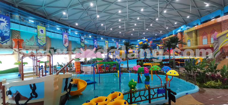 水世界內配置了巨型造浪池、酷爽水上滑梯(巨獸碗中碗滑梯,彩虹滑梯,螺旋組合滑梯)、愜意漂流河、歡樂(lè )兒童戲水區、星空泡池區、精油泡池區等等。