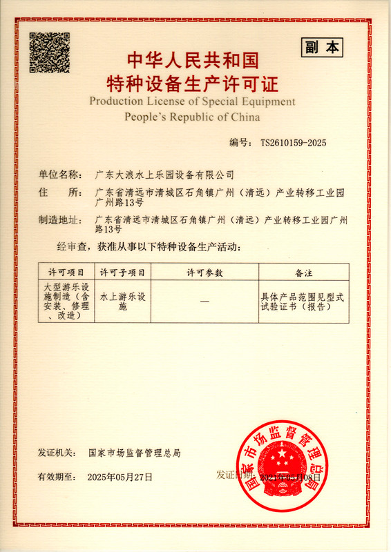 公司擁有國家市場(chǎng)監督管理總局頒發(fā)的《中華人民共和國特種設備生產(chǎn)許可證》以及30余項國家專(zhuān)利,擁有規劃策劃、機械和鋼結構、水處理、電氣等實(shí)力強大的專(zhuān)業(yè)工程師隊伍,經(jīng)驗豐富的施工隊伍以及售后服務(wù)隊伍;規劃建造的代表性項目有浙江九龍山樂(lè )滿(mǎn)地水上樂(lè )園、山東威海福地傳奇水上樂(lè )園、廣西百色星河水世界、河南許昌瑞貝卡水上樂(lè )園、泰國清邁星際迷航水上樂(lè )園、越南富國島水上樂(lè )園、浙江太湖龍之夢(mèng)嬉水樂(lè )園、廣州增城森林海嬉水世界等等。