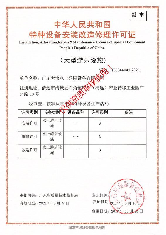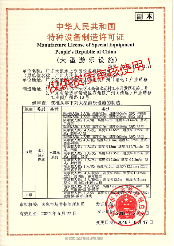 二、投資水上樂(lè)園要選擇有特種設(shè)備制造和安裝改造修理許可證和一定經(jīng)驗(yàn)的廠家,這個(gè)是最基本的前提;特種設(shè)備不是開玩笑的,同時(shí)新產(chǎn)品必須經(jīng)過(guò)設(shè)計(jì)文件鑒定和型式試驗(yàn)方可投入使用,它是設(shè)備能否投入市場(chǎng)的合法條件。我們游樂(lè)行業(yè)一直在強(qiáng)化這些方面,如果甲方漠視這兩點(diǎn),面臨的將會(huì)是關(guān)園整改甚至直接取締。為此,我公司在新的研發(fā)基地內(nèi)部專門建造了5000平米的試驗(yàn)區(qū),用于新產(chǎn)品的試驗(yàn)。