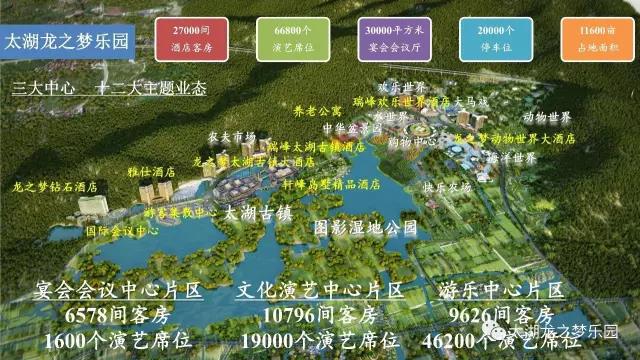 是一個集星級酒店群、太湖古鎮(zhèn)、大馬戲、動物世界、海洋世界、歡樂世界、嬉水世界、快樂農(nóng)場、飛禽及濕地公園于一體的大型旅游度假區(qū)。集“吃、住、行、游、購、娛、養(yǎng)、育、展”九種功能要素為一體的大型旅游目的地項目。