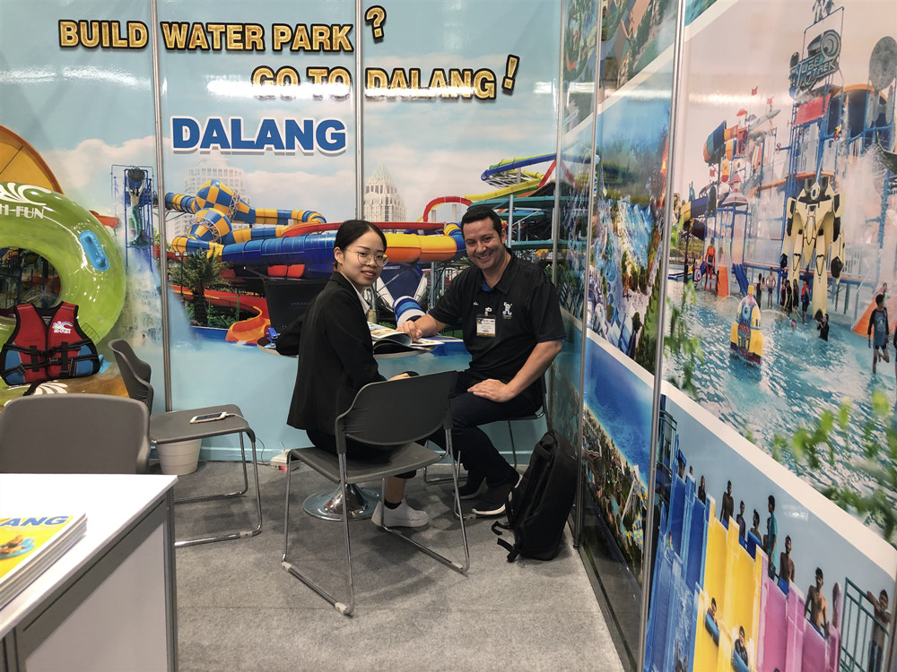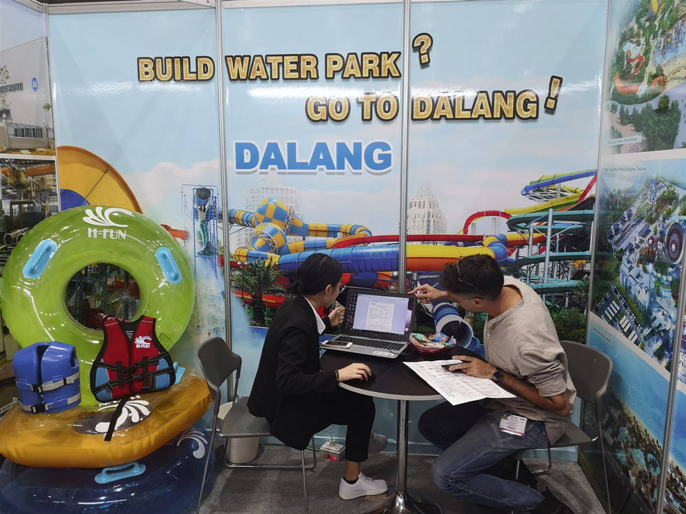 作為TAAPE 泰國展的新面孔,參展當(dāng)天前來咨詢洽談的客戶絡(luò)繹不絕,通過現(xiàn)場了解企業(yè)發(fā)展、產(chǎn)品的設(shè)計生產(chǎn)理念、加工工藝等相關(guān)信息,不少客戶對水上樂園的產(chǎn)品產(chǎn)生濃厚興趣,并同我司銷售人員進(jìn)行深入洽談交流。