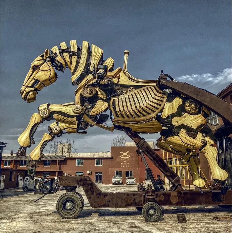 中華巨馬是中國首個自主知識產(chǎn)權(quán)的大型高端機(jī)械仿生裝置,也是國內(nèi)首個高科技“行進(jìn)秀”裝置。早在2019年夏季達(dá)沃斯論壇期間,“中華巨馬”就已經(jīng)完成了它的“首秀”,并在當(dāng)年9月正式落地開封清明上河園。這只既汲取唐三彩唐馬造型,又富有現(xiàn)代機(jī)械傳動手法的巨型蒸汽朋克風(fēng)格產(chǎn)品一經(jīng)亮相,立刻吸引了大量游客駐足觀看,引發(fā)轟動效應(yīng)。