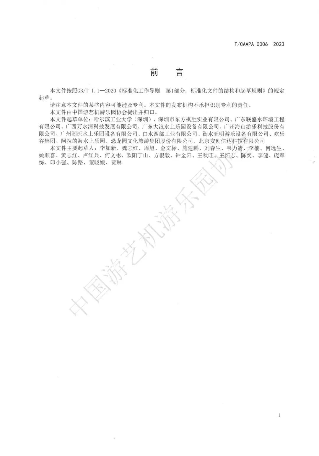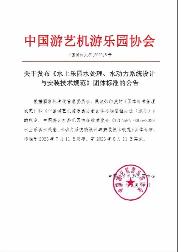 廣東大浪水上樂(lè )園設備有限公司總經(jīng)理何遠生、常務(wù)副總經(jīng)理兼技術(shù)總監姚順喜參與起草制定的《T/CAAPA 0006-2023 水上樂(lè )園水處理、水動(dòng)力系統設計與安裝技術(shù)規范》團體標準由中國游藝機游樂(lè )園協(xié)會(huì )正式發(fā)布,并將于2023年8月11日正式實(shí)施。