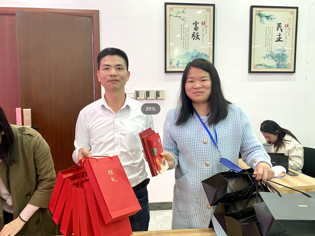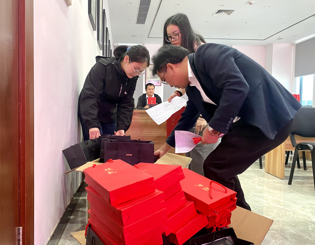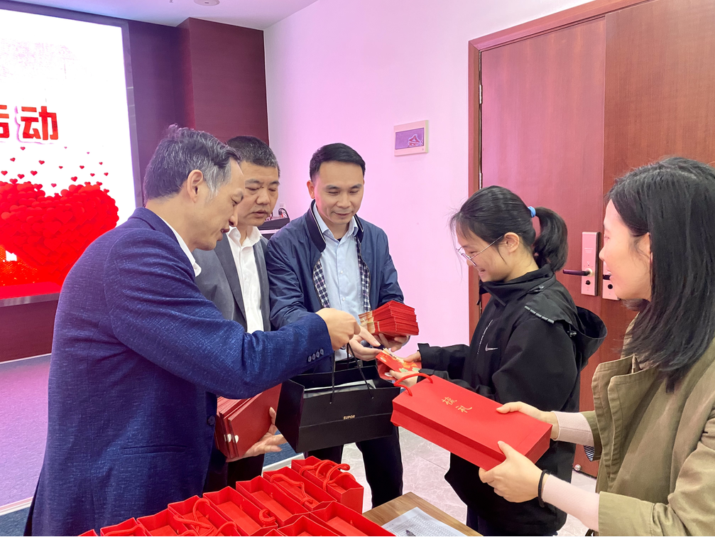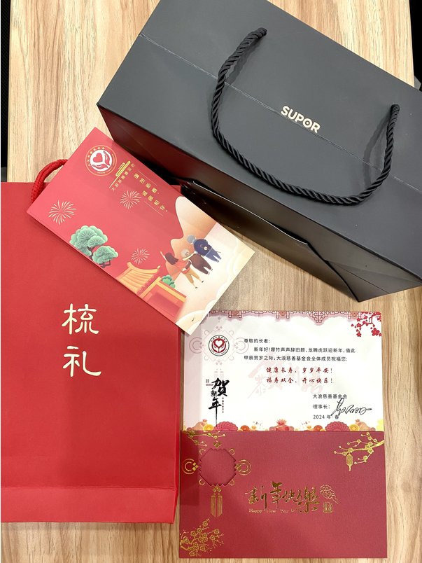 員工家屬代表老人領(lǐng)取發(fā)放禮物及紅包
