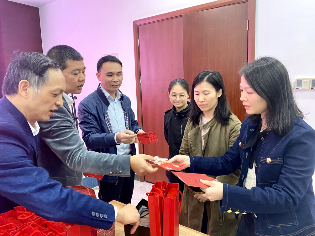 ▲“大浪慈善基金會(huì )”顧問(wèn)委員李邑新、理事長(cháng)趙石陽(yáng)、副理事長(cháng)楊平為員工家屬代表發(fā)放禮物及紅包。